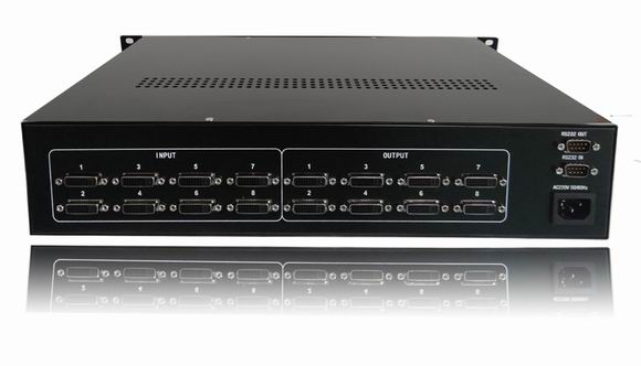 11、 DVI矩阵切换器是专门为计算机显示信号以及高分辨率DVI图像信号的显示切换而设计的高性能智能矩阵开关设备,用于将各路电脑信号输出通道中的任一通道上,该系列产品广泛用于大屏幕投影显示工程、大屏拼接、电化教学、指挥控制中心、多媒体会议室等场合;