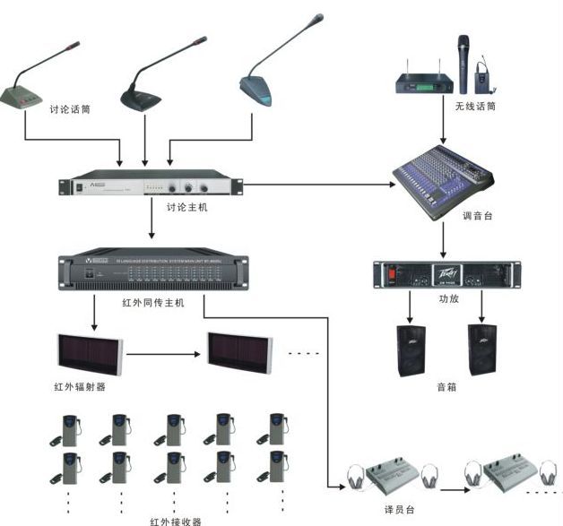 WT-5000J系统是一套数字红外同传系统,译员台手拉手连接,拥有众多方便功能,支持多达12种语言翻译能力,操作简便。把翻译后的语言利用红外光波作为传输媒介,通过红外辐射器将通道语言发送到红外接收单元,根据个人的需要选择所需通道收听。辐射器发射距离可达30米,发射角度90°,在其发射覆盖范围内,接收单元可以置于任意地方都能清晰接收。辐射器可壁挂安装或支架安装。