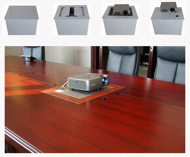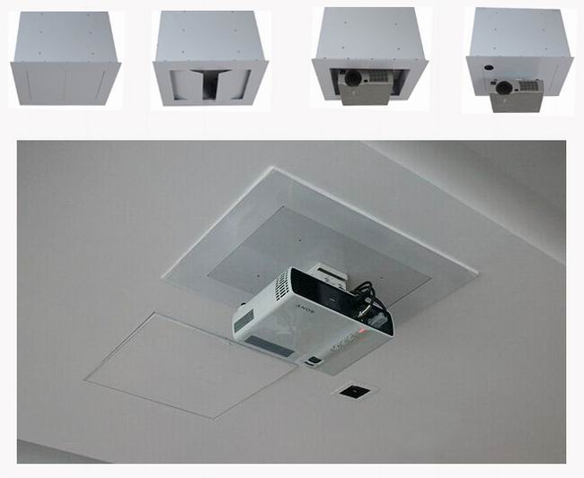 长方形盒式外表,采用合金钢制作而成,螺旋螺杆工作原理,最大的优势是噪音低两扇门可自动收回,国际,国内首创,款式新颖、美观大方、操作容易、灵活方便、工作可靠、经久耐用具有防盗保护。给贵公司的投影机提供了贴身保护和优良的服务。投影机不使用时,收藏在机箱内,并有门关闭着,使投影机受到良好的保护,并有防盗功能。使用投影机时,能自动开启盒门,投影机从盒内往外伸出,供使用。用完后,又能使其向上缩回盒内,自动关上门。全部动作都由电器、机械完成。动作准确,伸缩自如,任凭用户操纵指挥。具备手控,遥控和集控(RS232)功能.