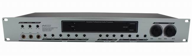 带有加超低声道控制输出:设计有单独的超低信号输出,设分频点(45-250HZ)输出,频点及增益大小可调;包房需增加超低频音箱时,直接配置专业功放机推动便可;超低通道具备完善的防低频自激电路(话筒低切功能),当开启MIC,超低音乐输出切断或输出比例可调,防止超低增益过大影响话筒人声歌唱的输出,出现压抑感;当MIC关掉时超低音乐(3-5秒)后自动恢复!