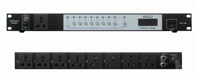 WT-108V时序器能够按照系统由前级到后级的顺序逐个启动各类设备;关机时则由后级到前级的顺序关闭系统设备。这样就能有效的统一控制所连接的用电设备,避免了人为的失误操作,彻底解决了终端器材(如功放、喇叭等)可能由于这种失误造成的损害,同时又可减低开/关用电设备对输电线路的冲击电流。由于其性能优越,将使系统管理员永远告别繁琐开关机的操作。用于控制系统用电设备开启/切断的时序器,是音响工程、电视广播系统、电脑网络系统及其它电气工程必不可少的元素,能够提供高达每端口2200W,具有多达64台联机功能,且能够设置所有联机的输出端口数量及开关机延时时间。