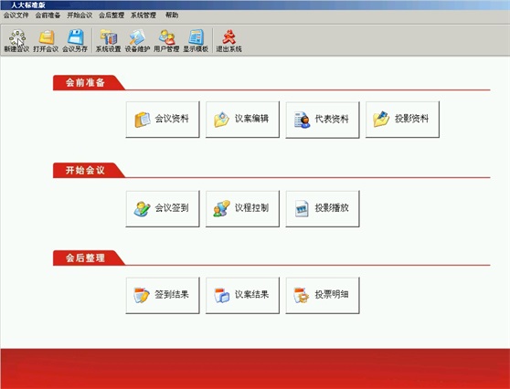 迈威特人大会议表决软件是一套完全针对政府/人大的议案表决、民主评议以及选举需求设计的专业会议表决系统。它根据开会的管理流程,将软件直观的设计为:会前准备、开始会议、会后整理、系统管理四大功能模块,直观易懂,操作简单,功能强大。软件界面如下: