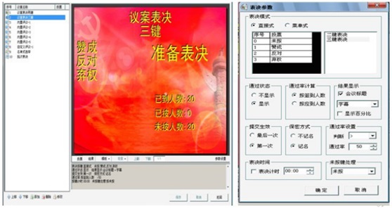 4、可设定表决模式(记名/不记名)、通过率、表决结果显示方式(操作员/主席/自动)等多种控制参数;