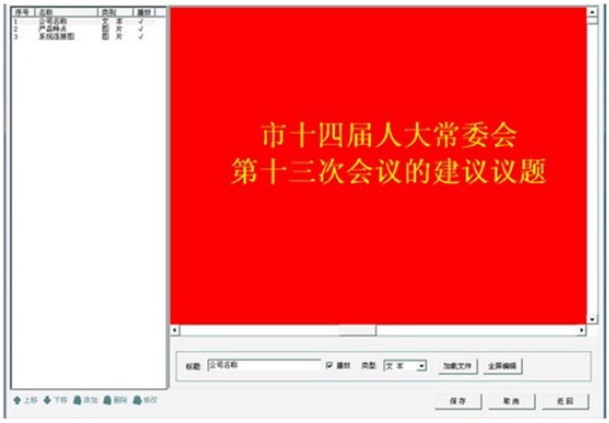 投影资料:用于会前或会中录入会议需要的各类投影资料,如:会议标语、各类演示资料、会议通知等,系统支持各类多媒体格式文件(图片/视频),也可直接编辑图片文字资料,功能强大。