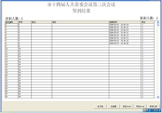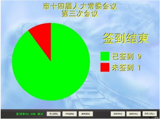 签到管理:对代表签到进行管理。除具有按键签到与IC卡签到功能外,支持与其它远距离签到系统集成,可实时显示签到代表信息,可通过代表签到情况设定表决器使用权限。签到模块支持中途补签、签退等功能,可根据代表到会情况动态签到。