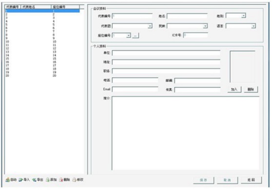 代表资料:用于录入参会代表的相关资料,包括:个人信息、照片、座席号等。